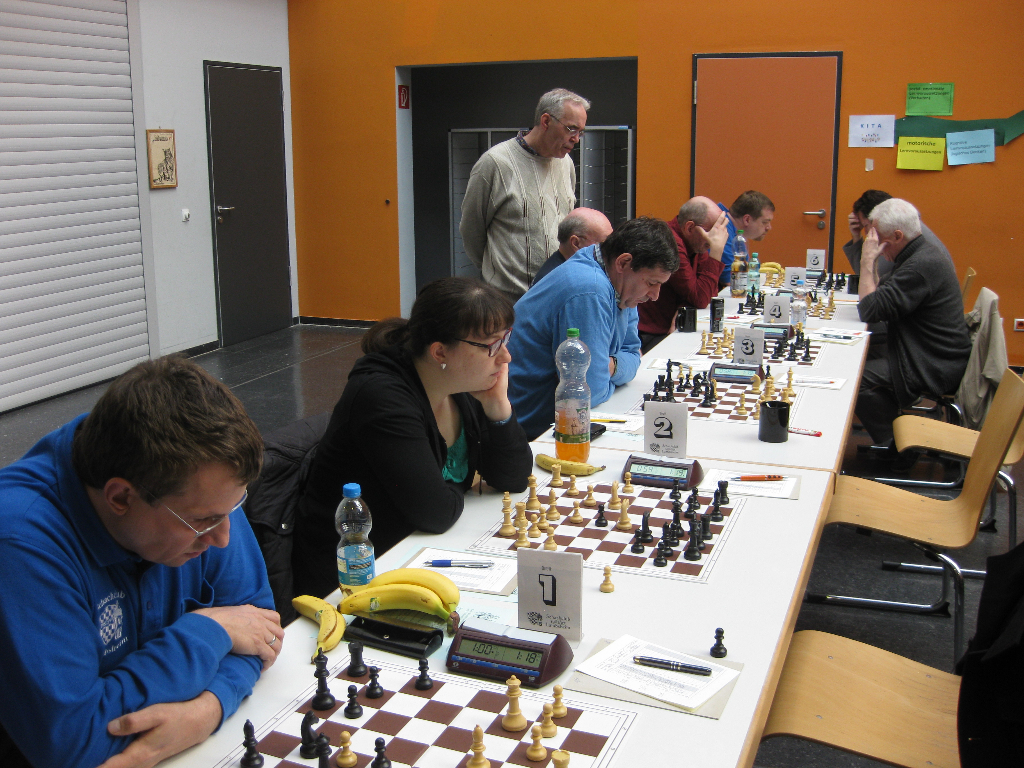 Im weiteren Verlauf vereinbarten Christine Ritter und ihr Gegner Bernd Knöppel an Brett 6 ein Remis, also erstmal 0,5:0,5. Dann wenig später passierte dem Spielpartner von Andreas Röder an Brett 5 mit Weiß ein ärgerlicher Patzer… Waldemar Falkenberg ließ einen Turm stehen und Andreas ließ nicht zweimal bitten: 1,5:0,5. Erste leichte Hoffnungen keimten auf, dass heute was gehen könnte, denn unsere Jugendspieler Thomas Mühlpfordt gegen Ralf Schwarzkopf an Brett 2 und Andreas Wacker gegen Jonas Schwarz an Brett 4 hatten es jeweils mit Weiß gegen die Sizilianische Verteidigung zu tun und standen nach der Eröffnungsphase leicht besser. Matthias Nagel an Brett 1 gegen Manuel Nitzsche und Christian Sigl an Brett 3 gegen Hans Schickedanz bekamen jeweils 1.e4 serviert und wählten beide die solide Caro-Kann-Verteidung. Daher war da erstmal nicht viel los.