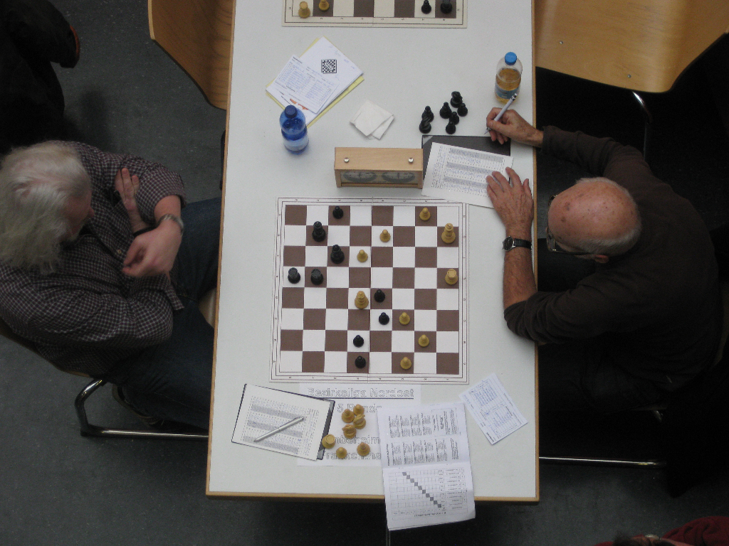 Ralph Ritter der zunächst auch unter Druck geraten war konnte sich immer besser befreien und hatte nun eine gewonnene Stellung auf dem Brett, so dass sein Gegenüber Hans Gusti Grünfeld die Partie aufgab zum 3:3.