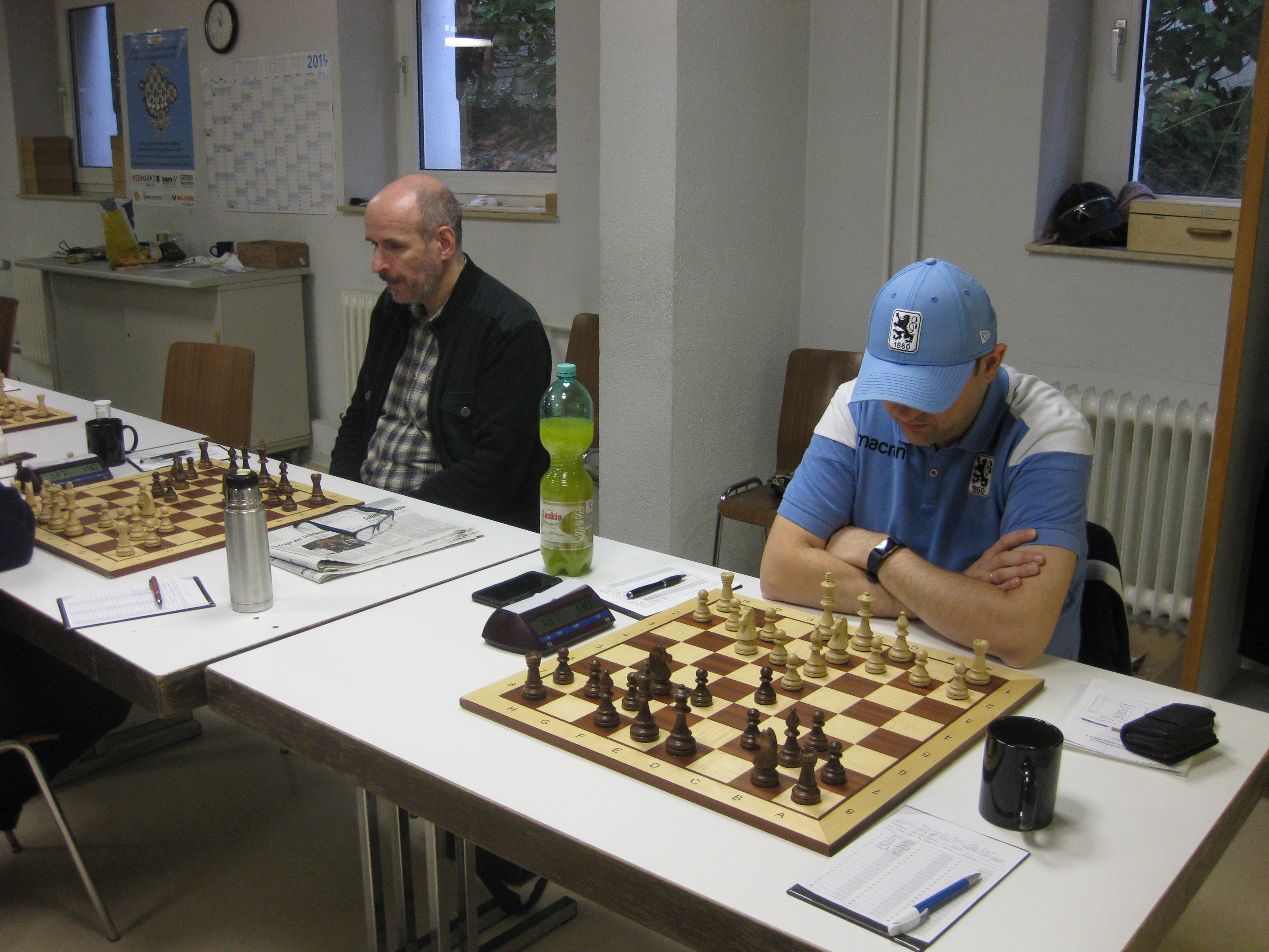 Auch in der Partie zwischen den beiden ehemaligen Mannschaftskollegen Michael Achatz und Gerhard Wahl war man nach 35. Zügen in komplizierter Stellung in Zeitnot und einigte sich daher ebenfalls auf ein Remis, so dass es nun 3,5,1,5 stand.